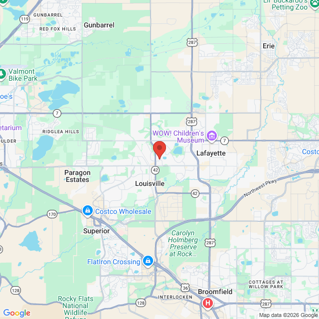 Louisville This is our new location now in Louisville. It is located in the practice of Wild Blue Acupuncture. There is a parking lot west of the building.